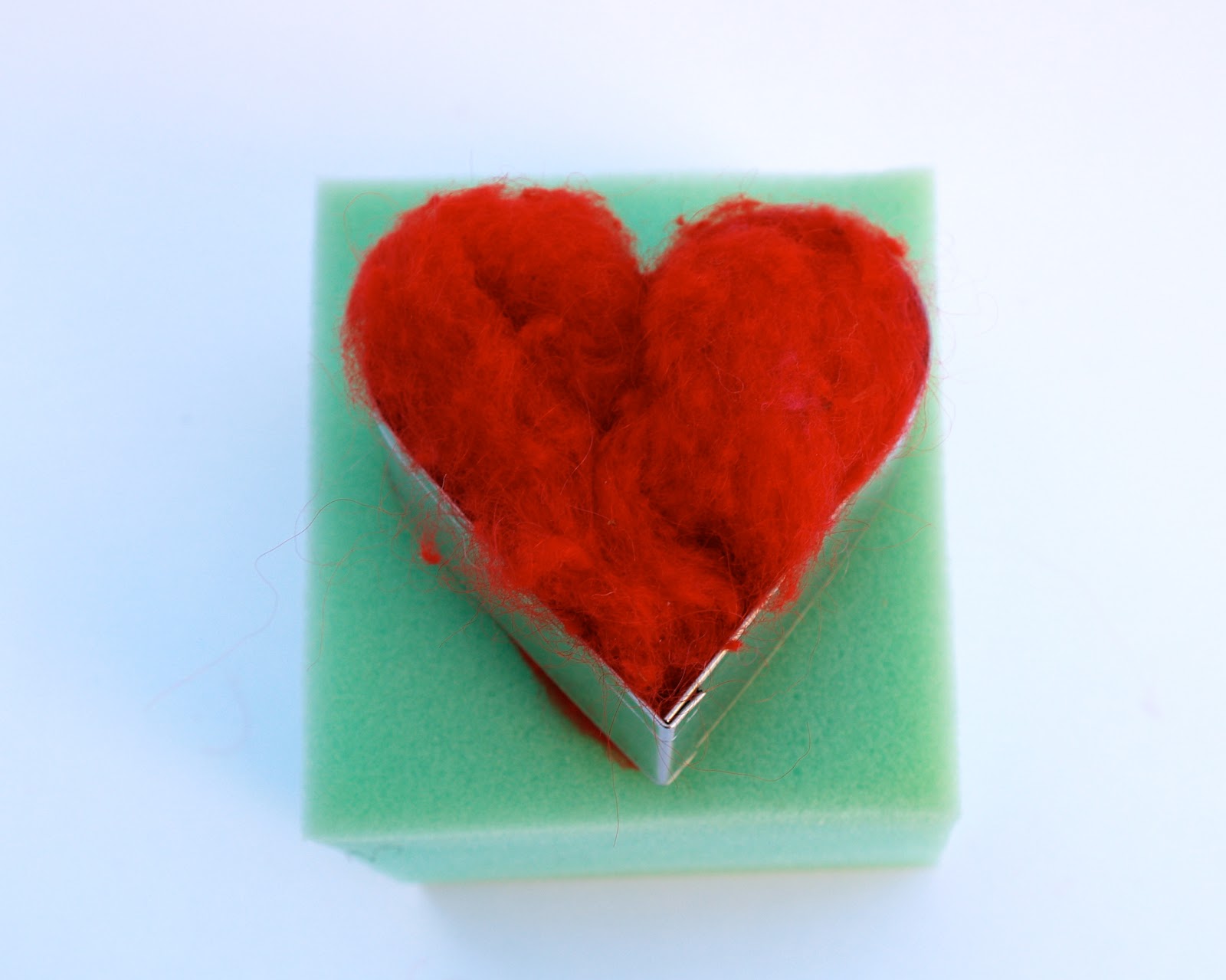When you feel you wool heart is well felted, gently slip it out from the cookie cutter mold. You might need to neaten up the edges by needle felting your heart some more.